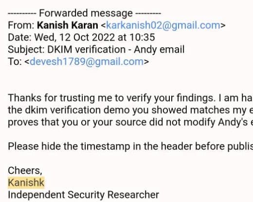 Back when the Hunter Biden laptop story broke, I called foul, criticizing the journalists for not DKIM authenticating the emails. They then sent me their “smoking gun” email, which I reluctantly verified as being true — in a way that anybody can replicate my work. DKIM can validate such emails even when we distrust the source of them. It’s the magic of cryptography.