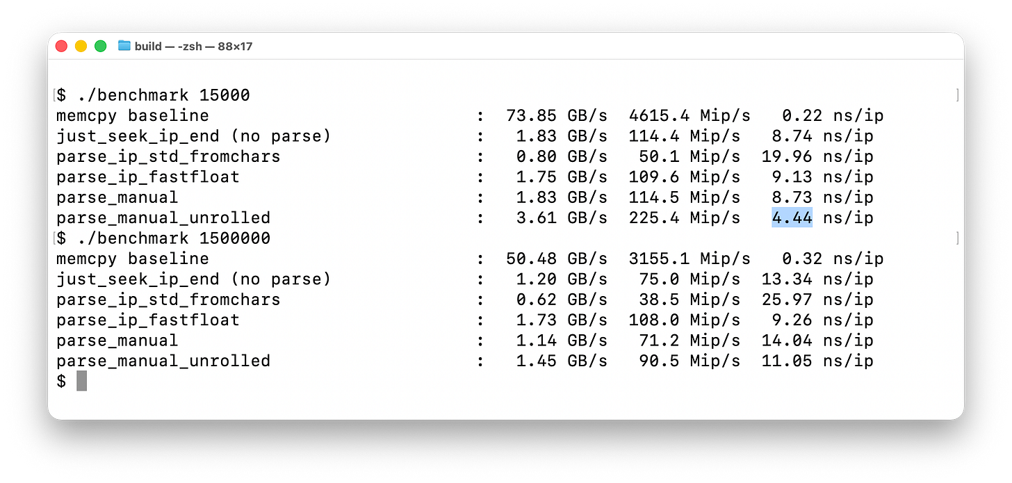 Instead of his original benchmark taking 4.4 nanoseconds per IP address, it now takes over double that, 11.05 nanoseconds. These are per address, calculated by total time divided by the number of addresses.