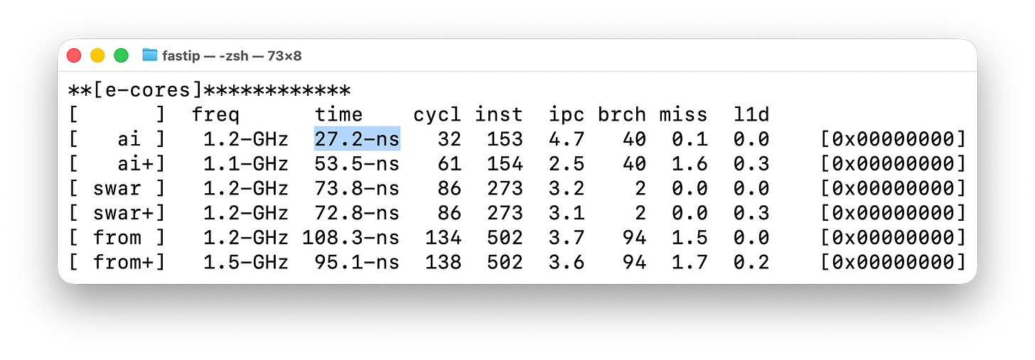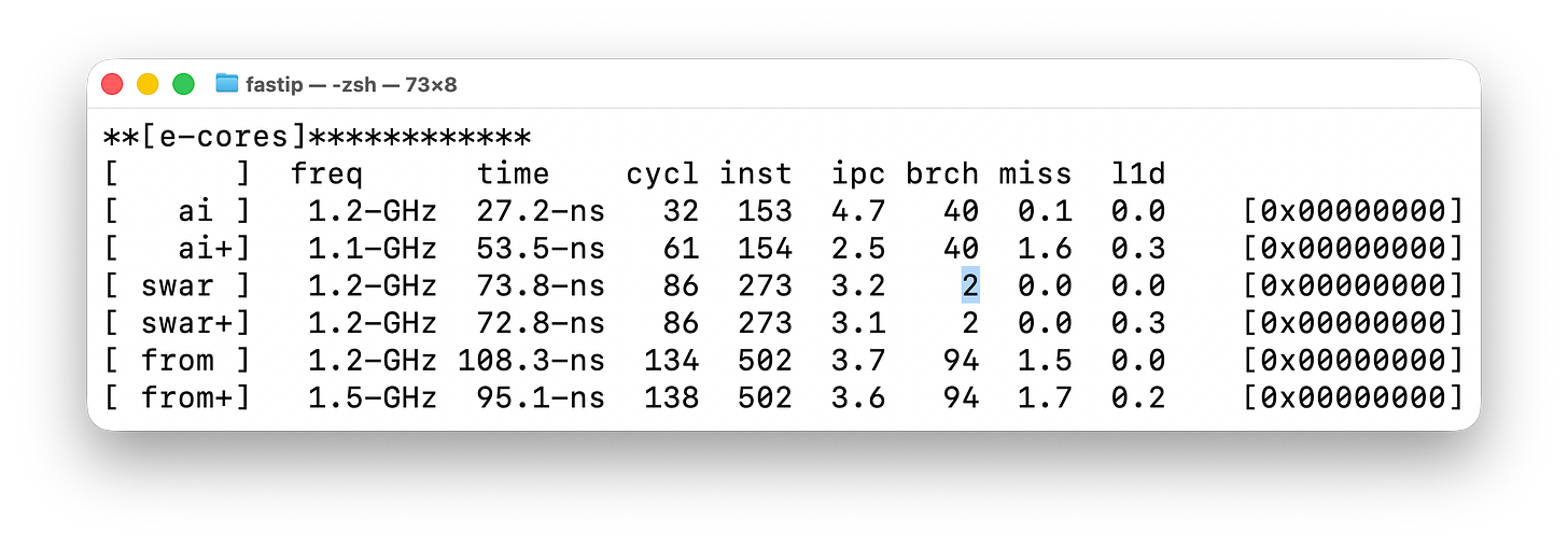 Another way I tested this is using an algorithm that gets rid of all branches. I’ve marked this in the screenshot below, in the [brch] column, where using SWAR techniques, the number of branches go from 40 to 2. And those branches come from simply calling the parse function.